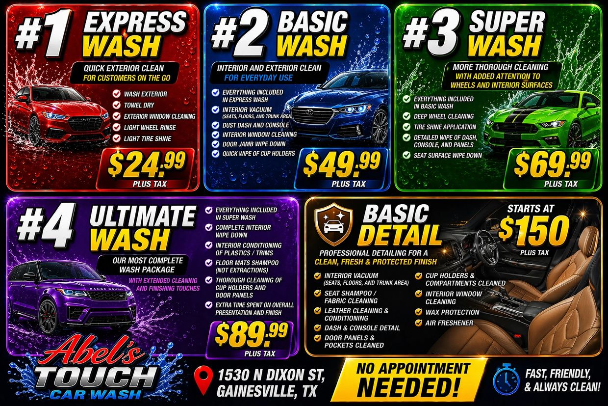 Looking for more than just a quick rinse? You found it. At Abel’s Touch Car Wash, we’re proud to be theonly full-service car wash in Gainesville, TX, delivering that next-level clean your vehicle deserves.